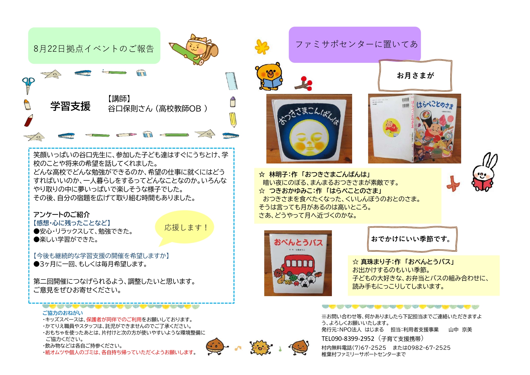 椎葉村交流拠点施設Katerieのキッズスペースでは「子育て応援プロジェクト」としてたくさんの取組を行っています。事業を実施している「NPO法人はじまる」さんが椎葉村からの委託を受け、ファミリーサポート他、子どもや子育てに関するあれこれを応援したり、相談を聞いたりしています。今後はこちらのサイトより毎月のイベントと子育てひろばの日程などを紹介していきます。