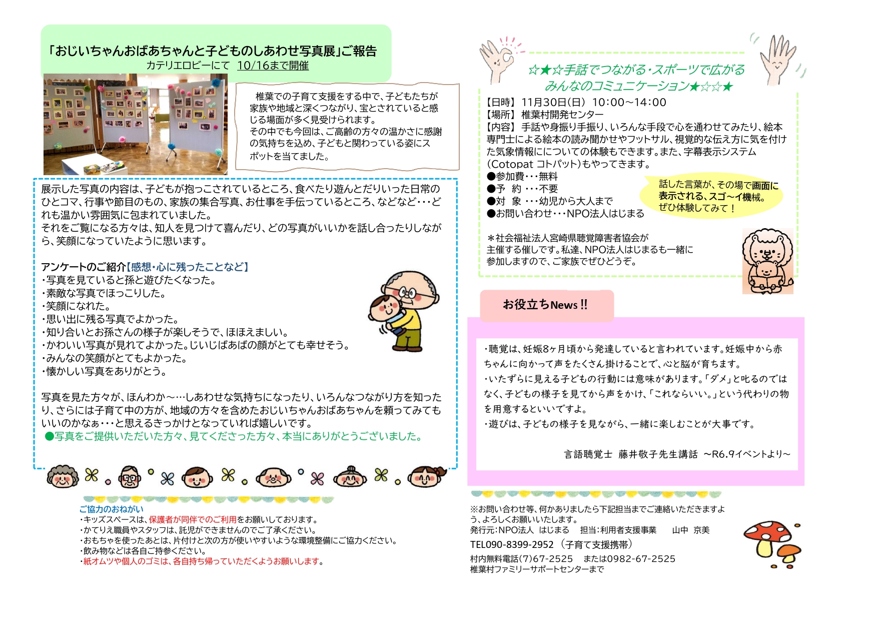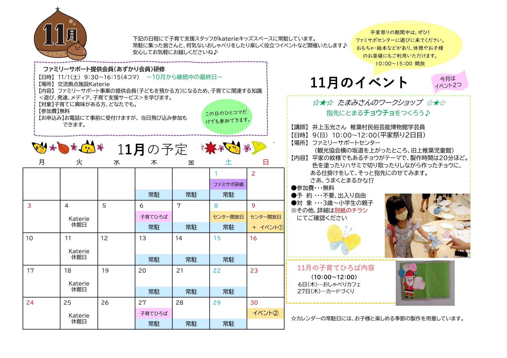 椎葉村交流拠点施設Katerieのキッズスペースでは「子育て応援プロジェクト」としてたくさんの取組を行っています。事業を実施している「NPO法人はじまる」さんが椎葉村からの委託を受け、ファミリーサポート他、子どもや子育てに関するあれこれを応援したり、相談を聞いたりしています。今後はこちらのサイトより毎月のイベントと子育てひろばの日程などを紹介していきます。