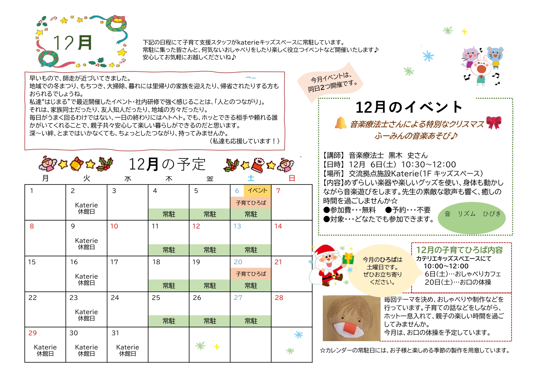 いろいろなイベント情報の発信や施設の紹介等を行っていきますのでぜひ交流拠点施設Katerieへお越しください。