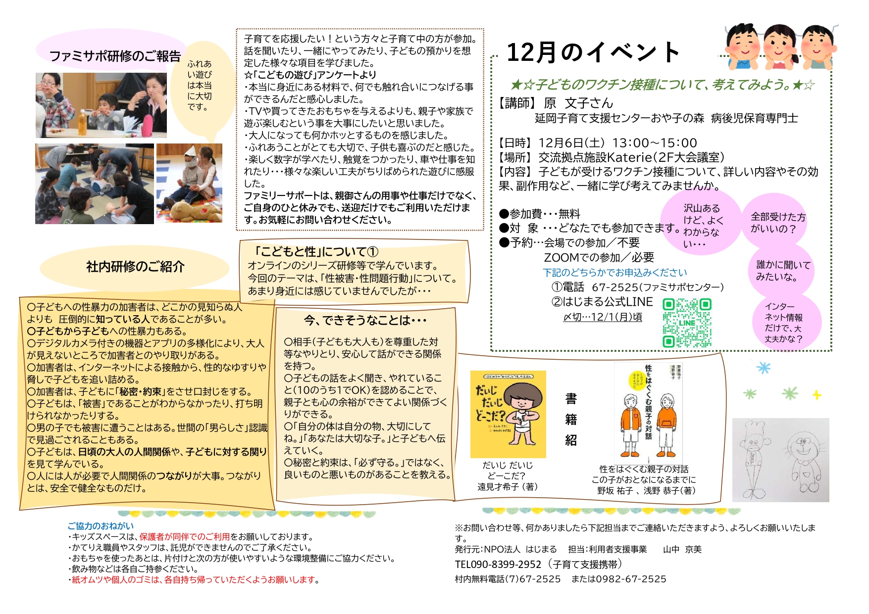 椎葉村交流拠点施設Katerieのキッズスペースでは「子育て応援プロジェクト」としてたくさんの取組を行っています。事業を実施している「NPO法人はじまる」さんが椎葉村からの委託を受け、ファミリーサポート他、子どもや子育てに関するあれこれを応援したり、相談を聞いたりしています。今後はこちらのサイトより毎月のイベントと子育てひろばの日程などを紹介していきます。