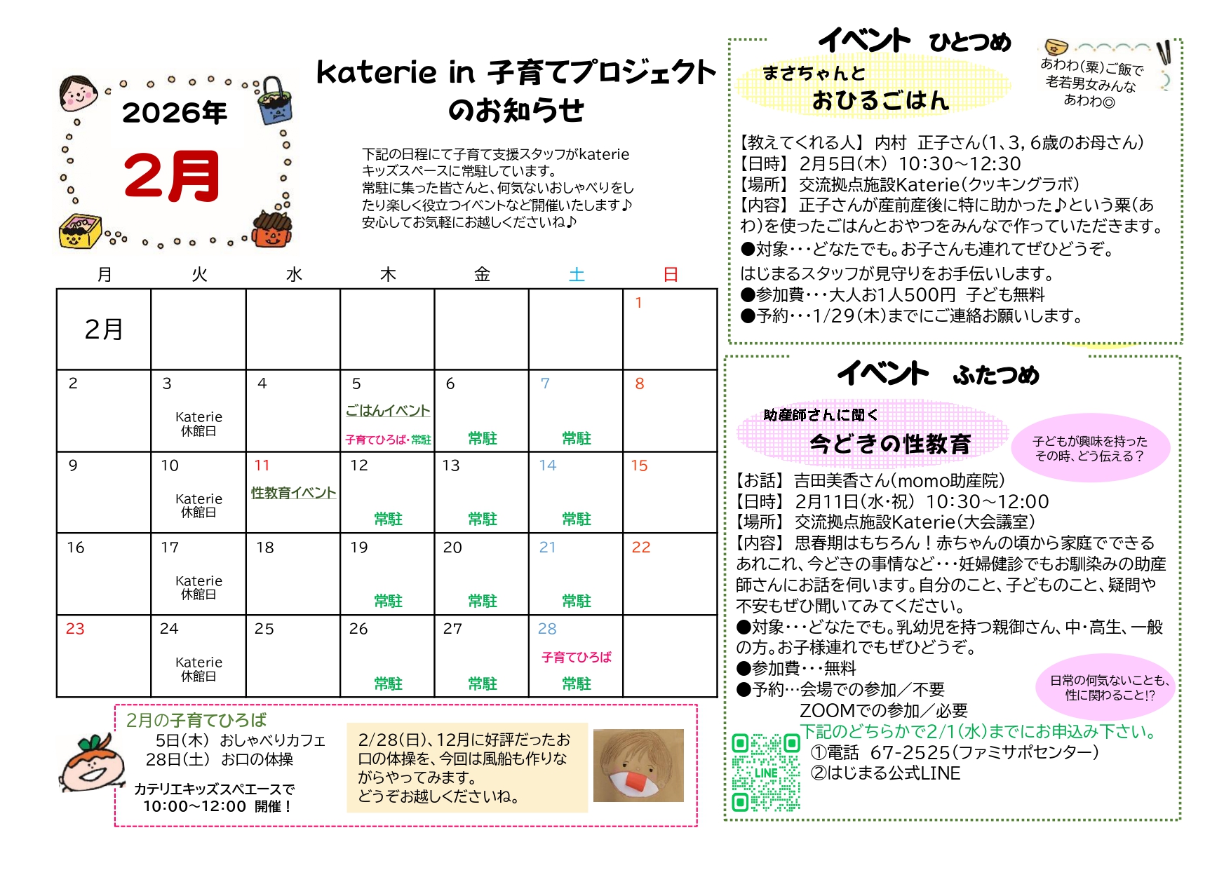 椎葉村交流拠点施設Katerieのキッズスペースでは「子育て応援プロジェクト」としてたくさんの取組を行っています。事業を実施している「NPO法人はじまる」さんが椎葉村からの委託を受け、ファミリーサポート他、子どもや子育てに関するあれこれを応援したり、相談を聞いたりしています。今後はこちらのサイトより毎月のイベントと子育てひろばの日程などを紹介していきます。