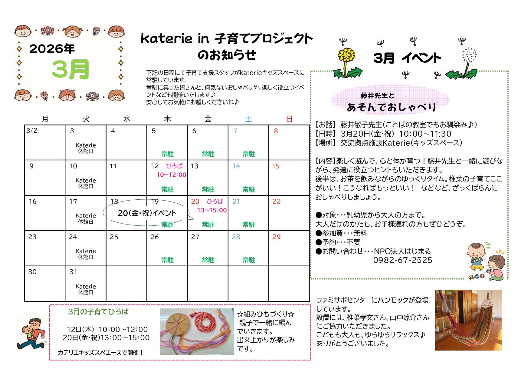 椎葉村交流拠点施設Katerieのキッズスペースでは「子育て応援プロジェクト」としてたくさんの取組を行っています。事業を実施している「NPO法人はじまる」さんが椎葉村からの委託を受け、ファミリーサポート他、子どもや子育てに関するあれこれを応援したり、相談を聞いたりしています。今後はこちらのサイトより毎月のイベントと子育てひろばの日程などを紹介していきます。