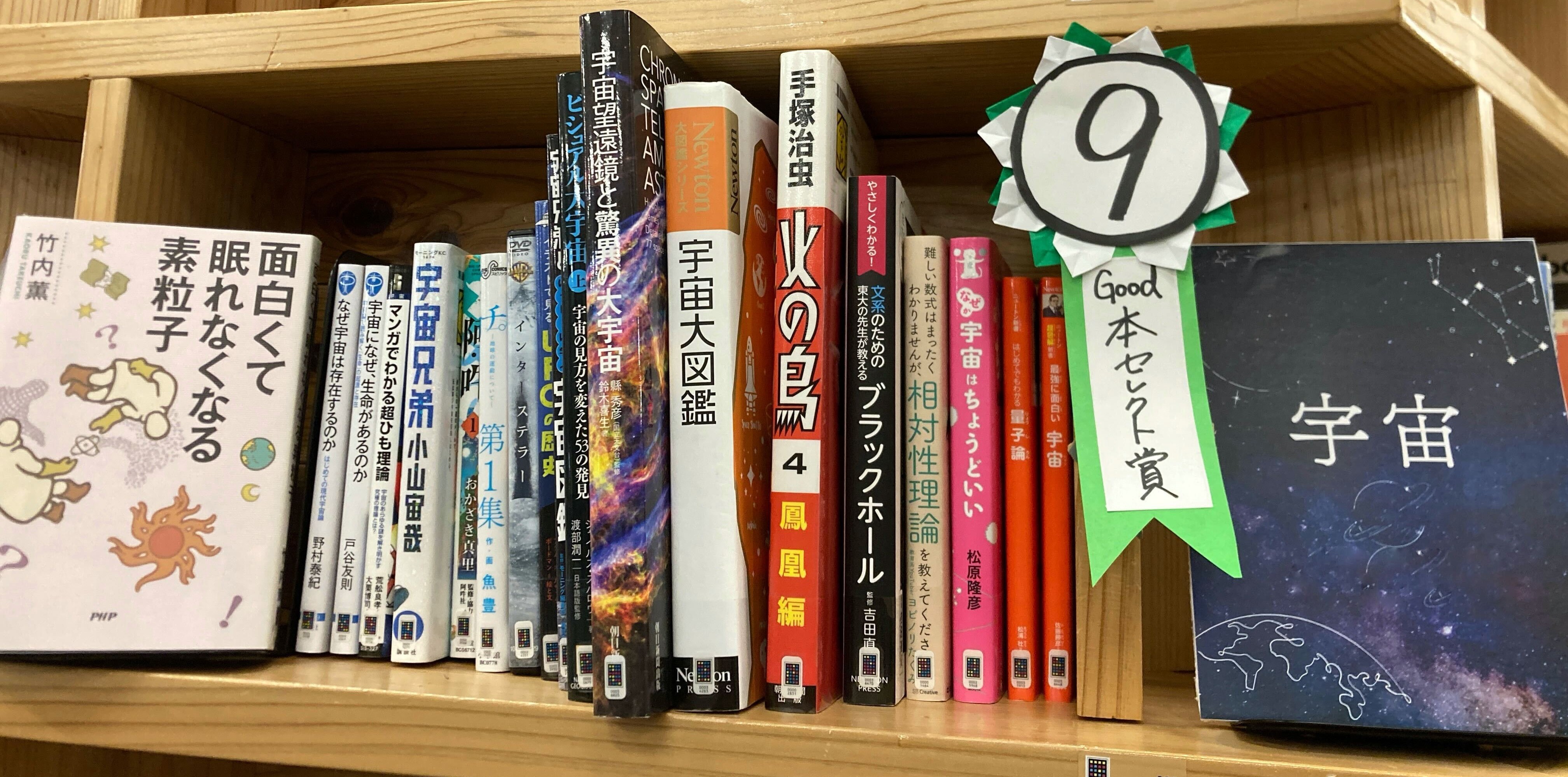 「Good!本セレクト賞」受賞作品1作目はこちらの棚!並べられた本のタイトルをなぞるだけで、宇宙とのつながりを感じる棚ですね。「宇宙のロマンを感じる」という素敵な投票コメントも!