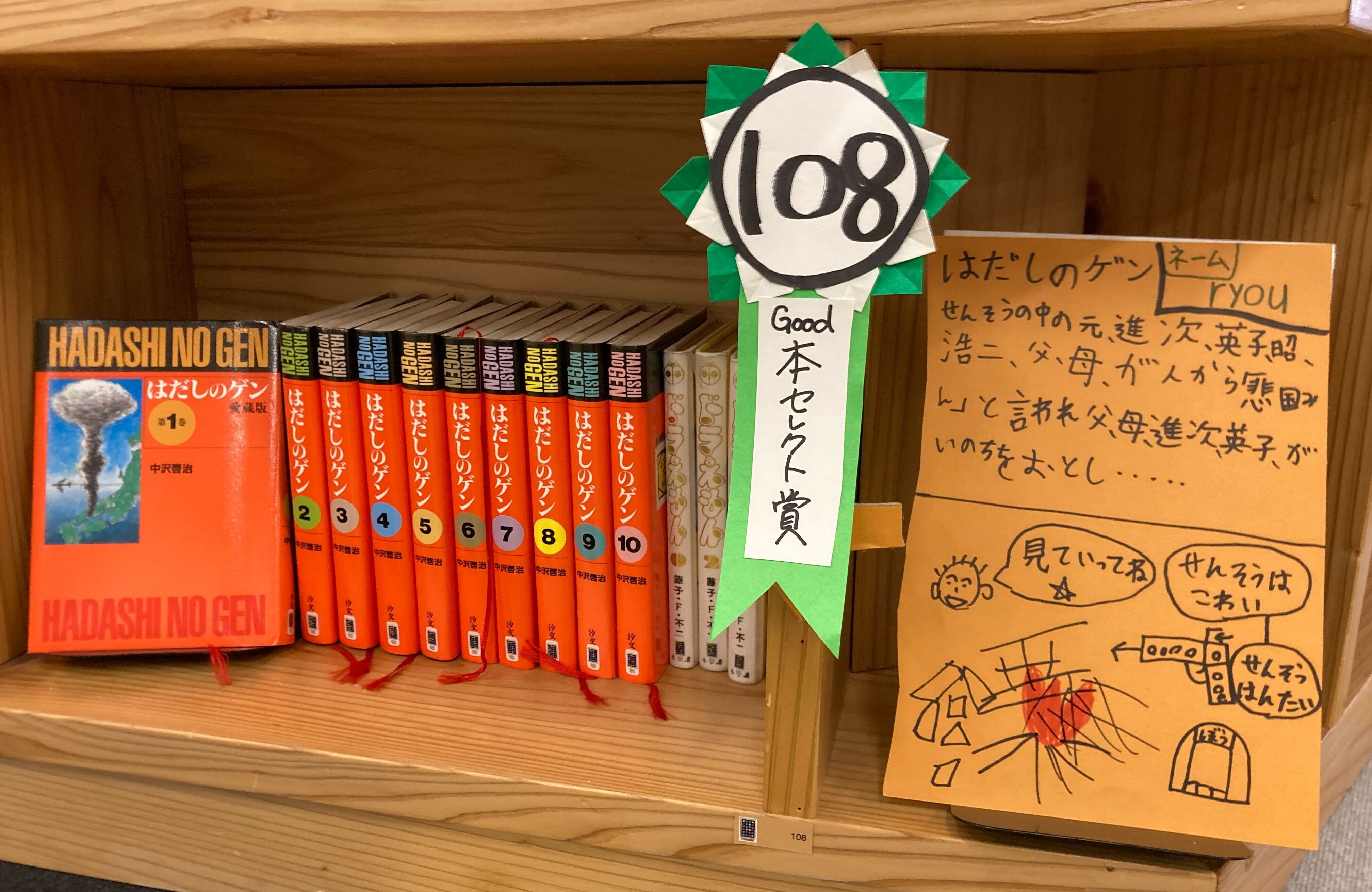 「Good!本セレクト賞」受賞作品3作目はこちらの棚!自分の好きな「ドラえもん」「はだしのゲン」をセレクトして並べてくれました。どちらも長年愛される本たちですね。