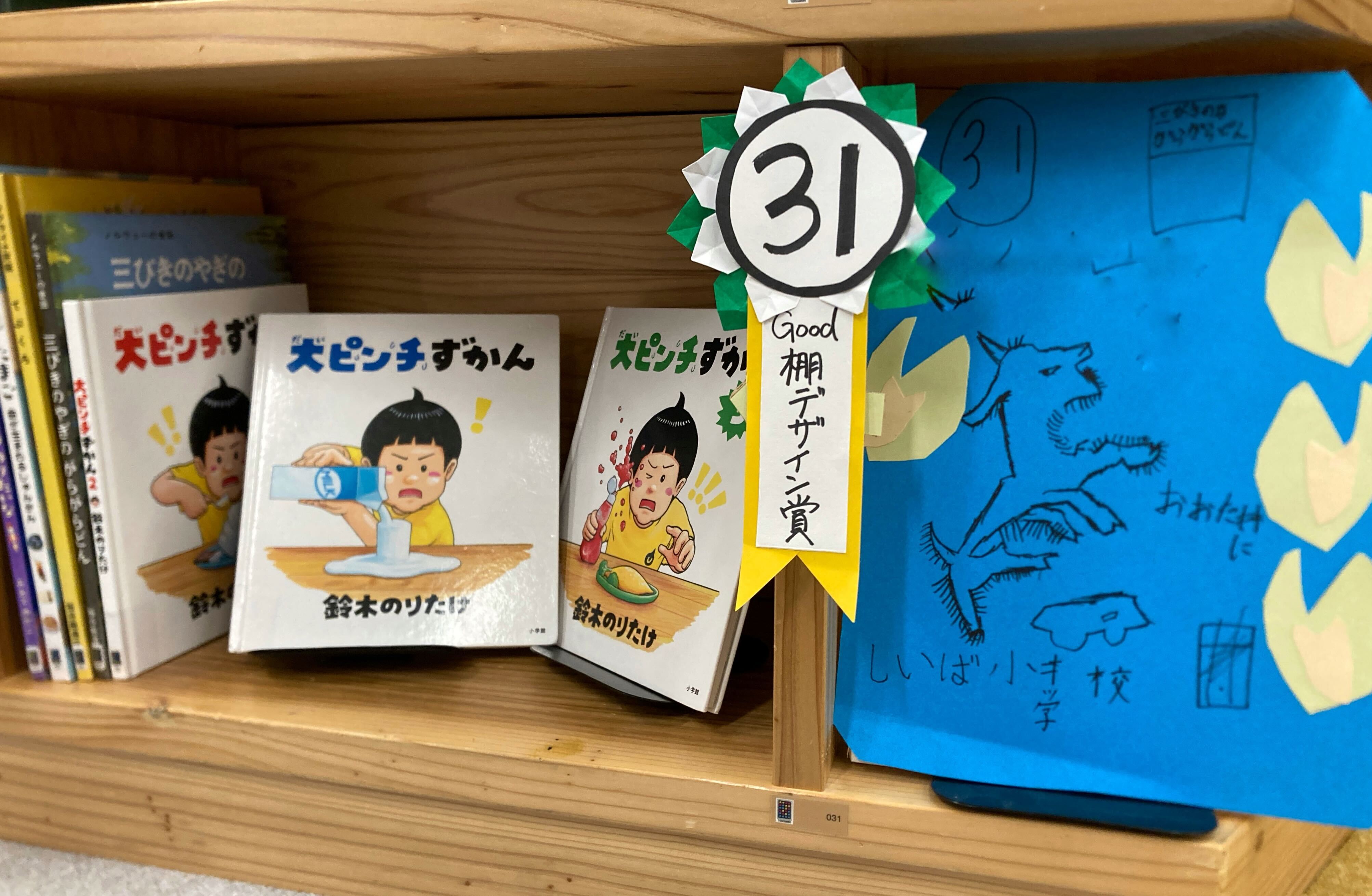 「Good!棚デザイン賞」受賞作品3作目はこちらの棚!好きな本の「大ピンチずかん」と「三びきのやぎのがらがらどん」を颯爽と持ってきてイラストに紹介してくれました♪