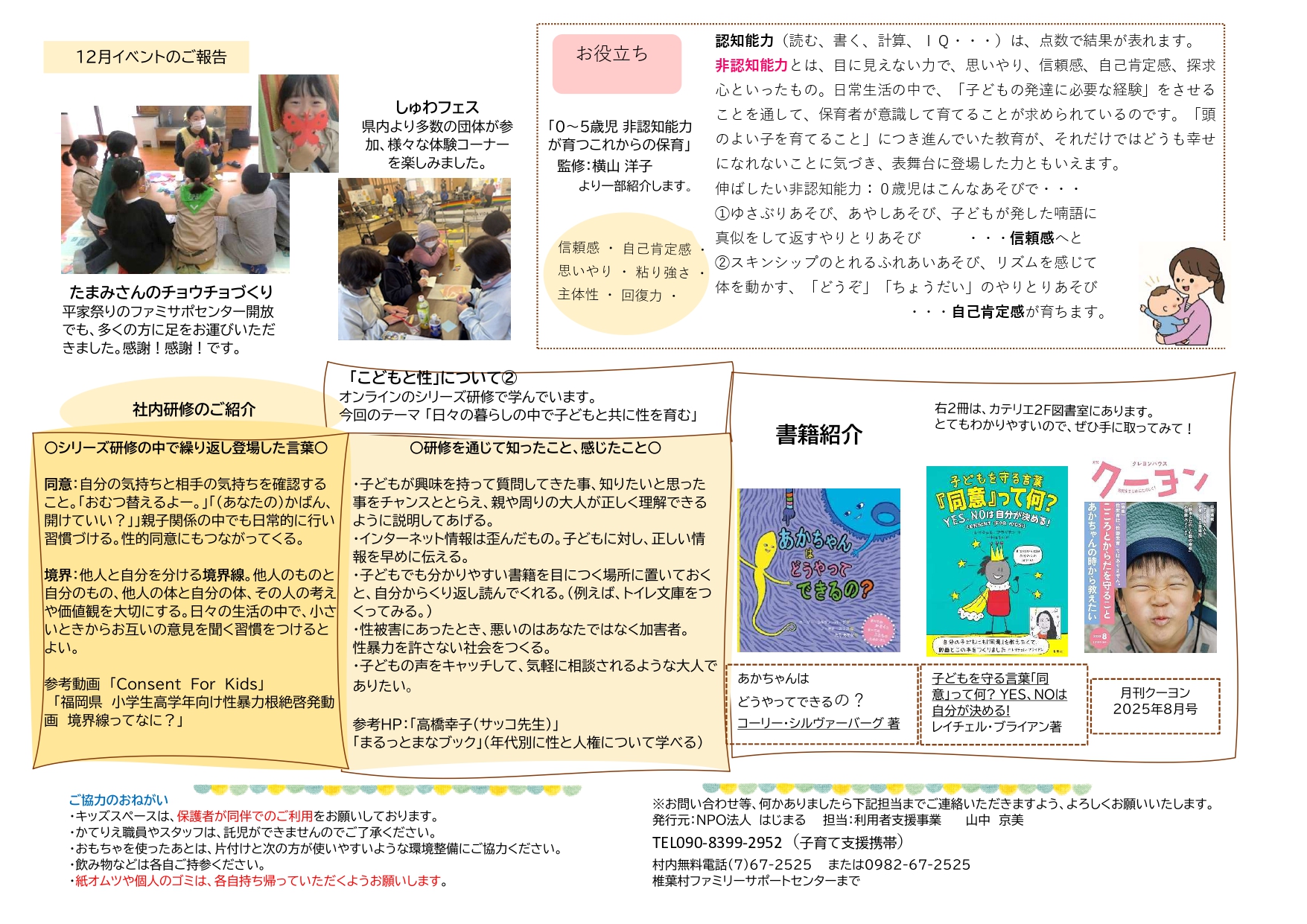 椎葉村交流拠点施設Katerieのキッズスペースでは「子育て応援プロジェクト」としてたくさんの取組を行っています。事業を実施している「NPO法人はじまる」さんが椎葉村からの委託を受け、ファミリーサポート他、子どもや子育てに関するあれこれを応援したり、相談を聞いたりしています。今後はこちらのサイトより毎月のイベントと子育てひろばの日程などを紹介していきます。