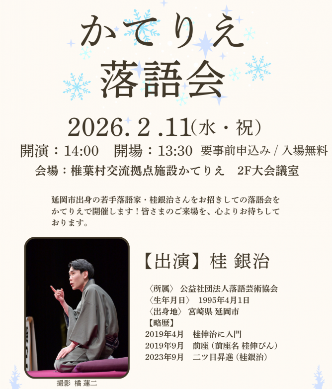 椎葉村交流拠点施設Katerieでは、延岡市出身の若手落語家・桂銀治さんをお招きし、「かてりえ落語会」を開催いたします。皆さまのご来場を、心よりお待ちしております。